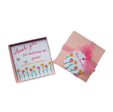 Sterling sliver earrings on a personalised card in a presentation box with a matching gift tag and ribbon. 3 box colours to choose from – pink, aqua and white. Lots of different messages / designs available. For further information or special requests contact me using the personalisation form under useful information at the bottom of the page.