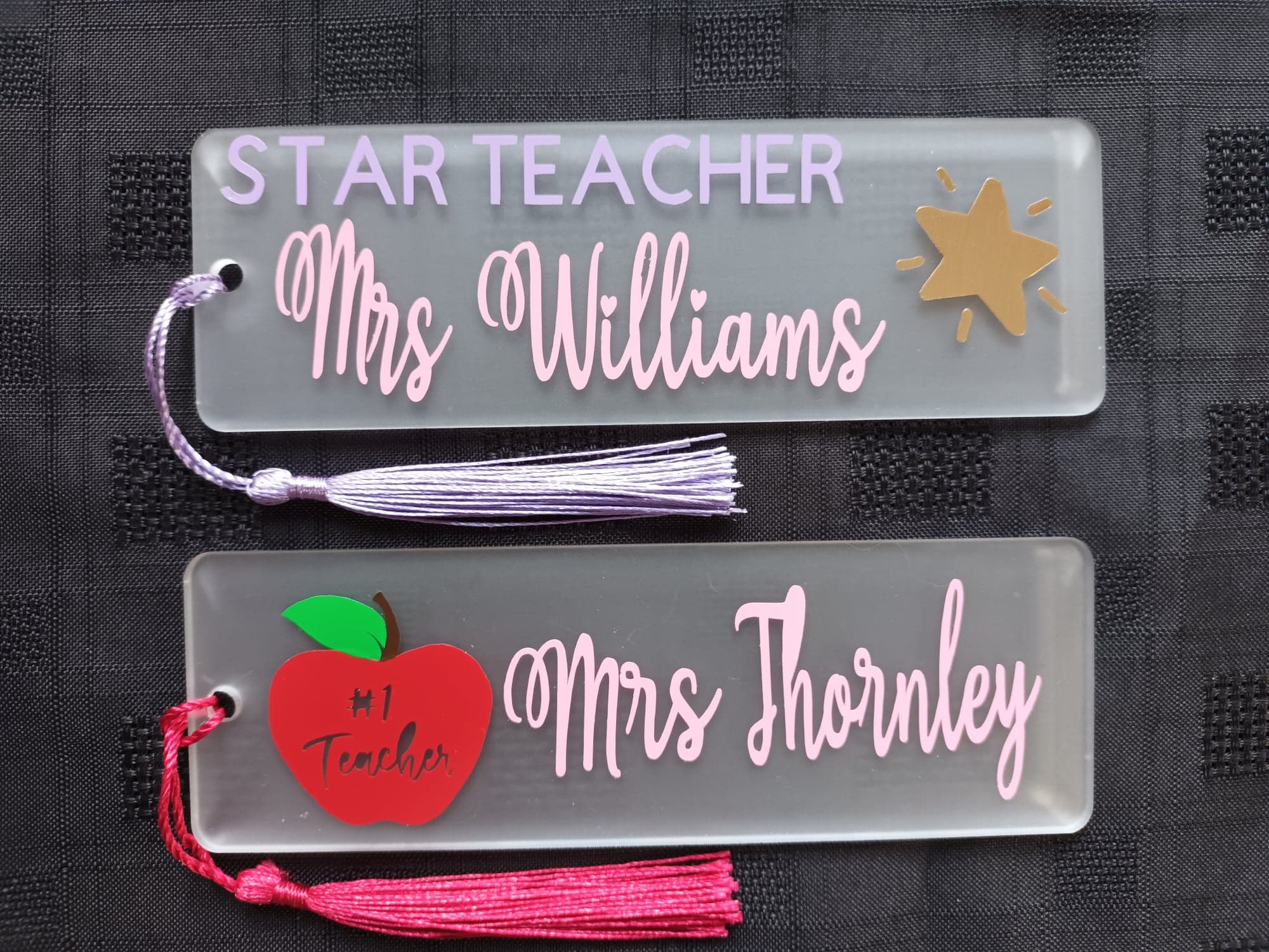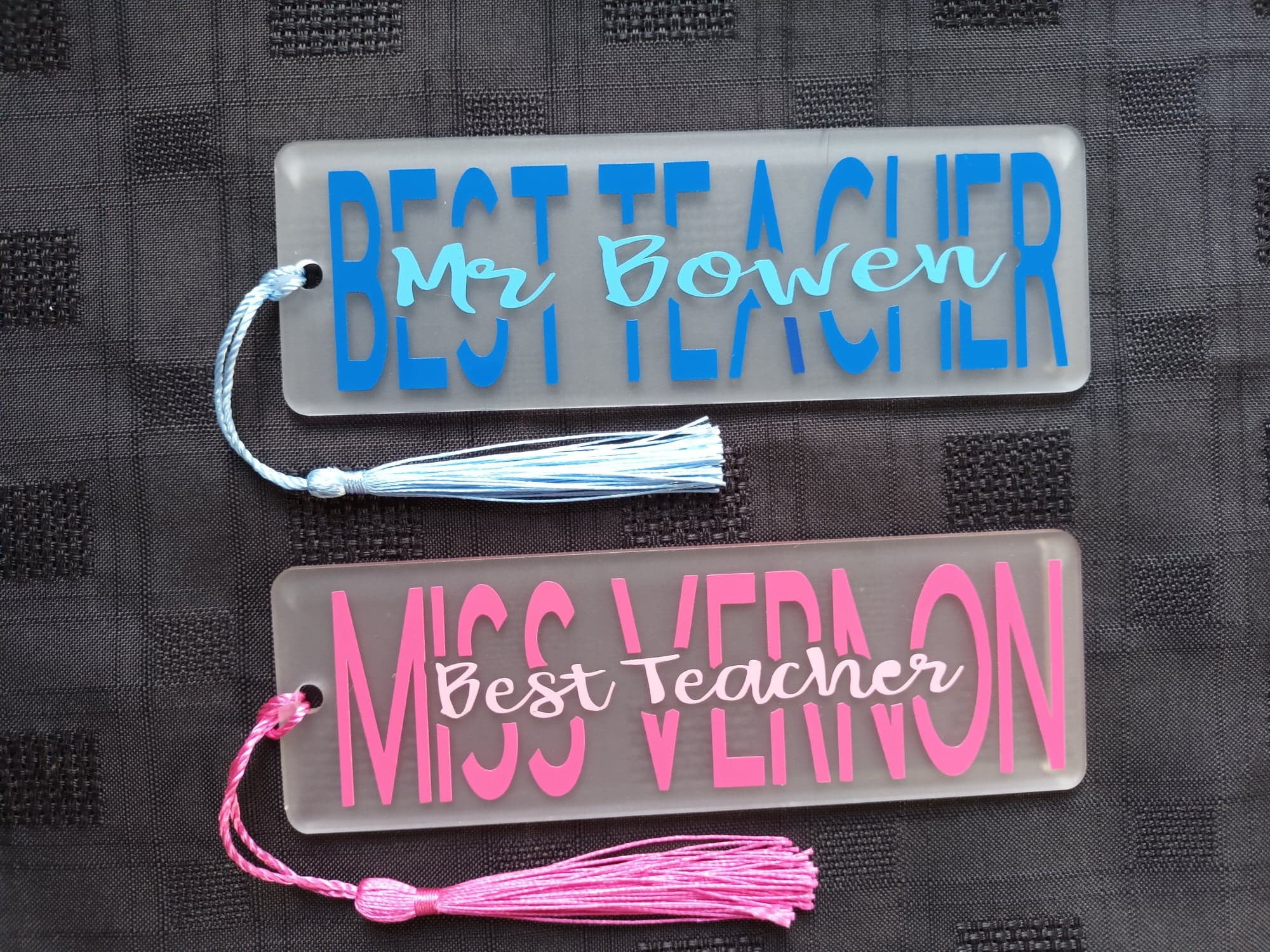 Celebrate the end of a school year with our teacher bookmarks. Personalised acrylic bookmarks (15cm x 5cm) can have any name on them. Lots of colours available with co-ordinating tassels, including silver and rose gold. Please leave a list of names and colours in the personalisation section as well as stating the bookmark required.sarah moreland