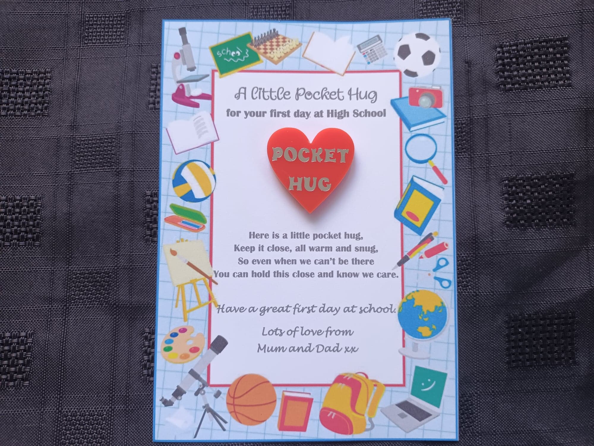 Got a little one starting school? Are they feeling slightly anxious? Why not give them a pocket hug? Our pocket hug is the perfect way to let someone know you care. An acrylic heart mounted on a decorated card. The pocket hug is attached to the card with a sticky dot so can be removed and placed in a pocket. It is small enough to carry anywhere and be reminded that you care. Message can be changed on request.sarah moreland