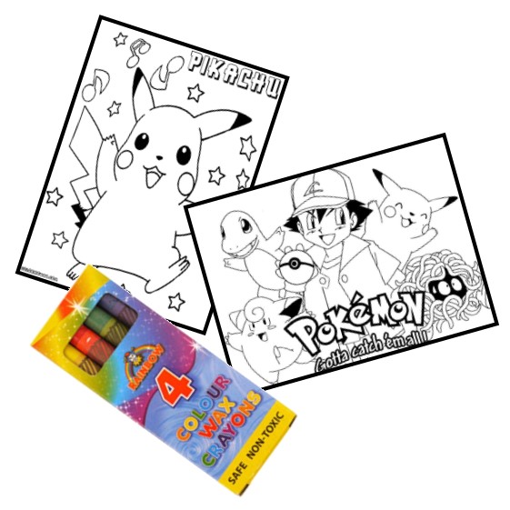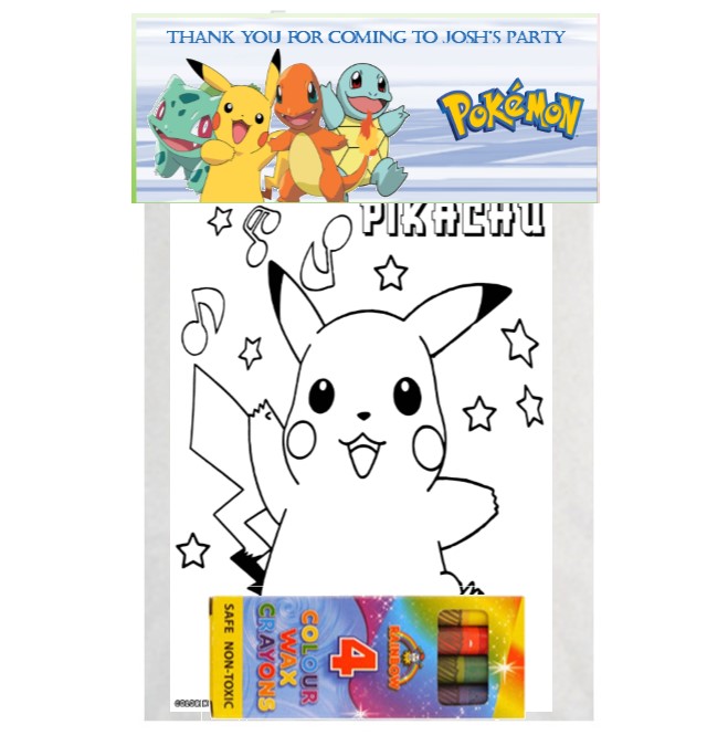 Pokemon Colouring Set Colouring set consisting of 2 A6 colouring sheets and wax crayons sealed in a cellophane package and topped with a personalised header.