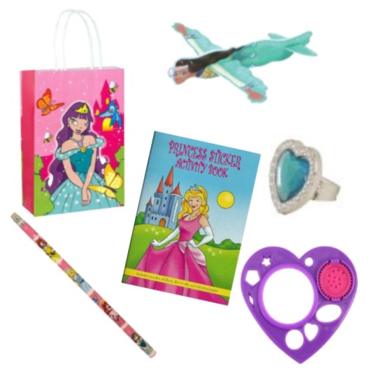 Princess Party Bag Princess twist handle party bag containing: ring, glider, activity book, pencil and heart stencil. Item colours may vary from those shown.sarah moreland