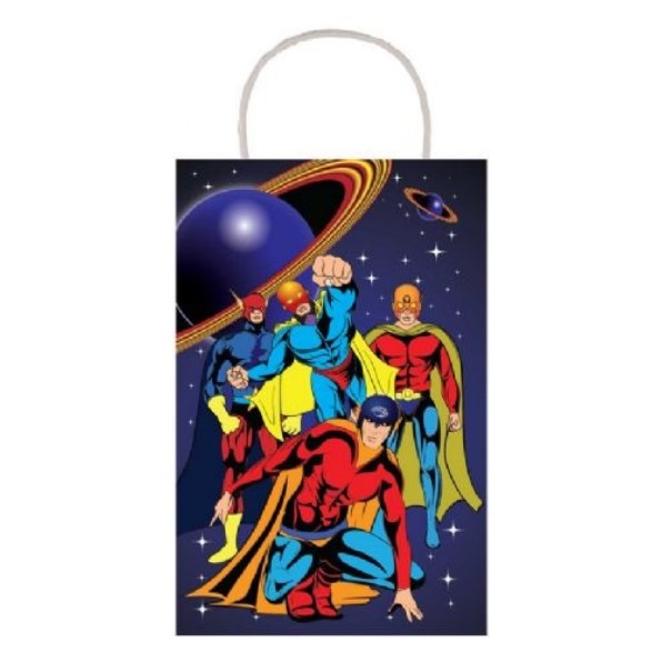 Superhero Design Paper Bag. High quality, colourful gusseted paper bag with strong paper twist handles. Size of each bag when open: 205mm x 140mm x 70mm. Coordinating items available.sarah moreland