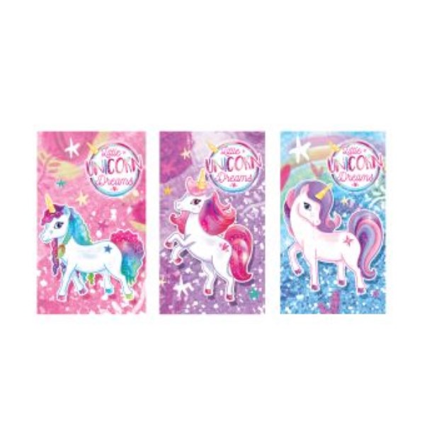 Unicorn Notebook Approximately 9.3cm X 5.5cm 3 assorted designs. 1 notebook will be supplied at random. Coordinating items available.sarah moreland